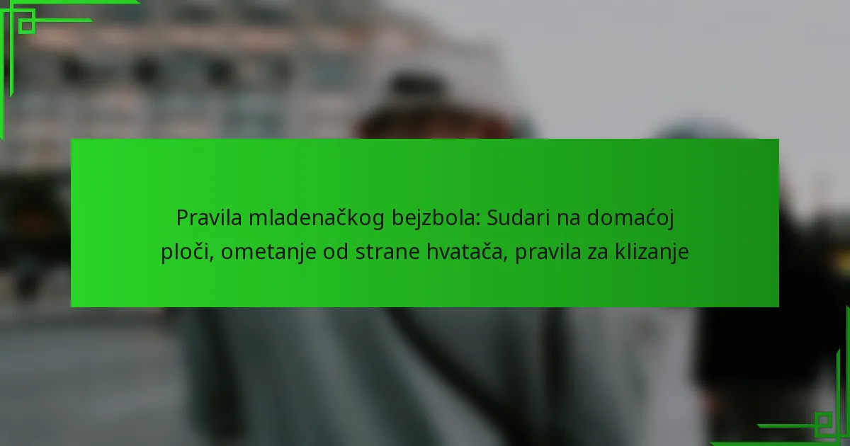 Pravila mladenačkog bejzbola o sudarima na domaćoj bazi, ometanju od strane hvatača i klizanju su ključna za osiguranje sigurnosti igrača i fer natjecanja. Pravila o sudarima na domaćoj bazi imaju za cilj zaštitu hvatača od opasnih udaraca, dok ometanje od strane hvatača rješava situacije u kojima hvatači ometaju udarce. Osim toga, pravila o klizanju mogu se razlikovati ovisno o ligi, što čini važnim da igrači i treneri razumiju specifične propise koji se primjenjuju na njihove utakmice.