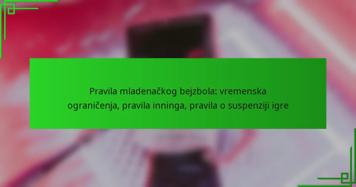 Baseball za mlade uključuje specifična pravila koja se odnose na vremenska ograničenja, pravila o izmjenama i suspenzije igre kako bi se poboljšalo iskustvo mladih igrača. Vremenska ograničenja obično se kreću od 1,5 do 2 sata, potičući angažman uzimajući u obzir razvojne potrebe sportaša. Pravila o izmjenama variraju prema dobnoj skupini, osiguravajući prikladnu igru, dok je razumijevanje pravila o suspenziji igre ključno za održavanje sigurnosti i kontinuiteta tijekom nepredviđenih prekida.